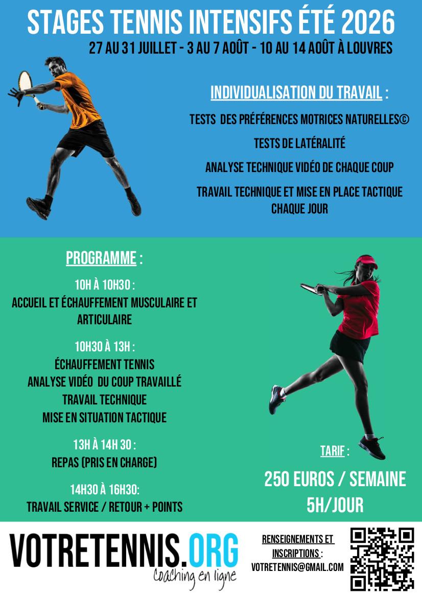 denebola Posté(e) il y a 3 heures Signaler Posté(e) il y a 3 heures Stages intensifs 2026 Les inscriptions pour les stages été 2026 sont lancées Les dates pour cette saison : - 27 au 31 juillet au 1er août de 10h à 16h30 - 3 au 7 août de 10h à 16h30 - 10 août au 14 août de 10h à 16h30 Le nombre de stagiaires maximum par semaine est de 6 Le programme : - Accueil à partir de 9h45 - 10h à 10h30 : Échauffement cardio, musculaire et articulaire. - 10h30 à 13h : Technique (1 coup travaillé par jour) + mise en situation tactique - 13h à 14h30 : Repas (compris dans le tarif du stage) - 14h30 à 16h30 : Travail du service et du retour de service + points La structure d'accueil : Le CMO Louvres, club du Val d'Oise se trouvant à 10' de Roissy Charles de Gaulle (30' de Paris), proche de l'autoroute A1, Station RER Ligne D. 3 courts extérieurs en dur, 1 en gazon synthétique et 3 greenset couverts. Piste d'athlétisme et terrain de sports collectifs à proximité. Le tarif : 250 euros la semaine repas du midi compris Toutes les informations ainsi que le dossier d'inscription sont disponibles en ligne sur la page dédiée du site : https://www.votretennis.org/stages Si vous avez des questions n'hésitez pas !! Citer